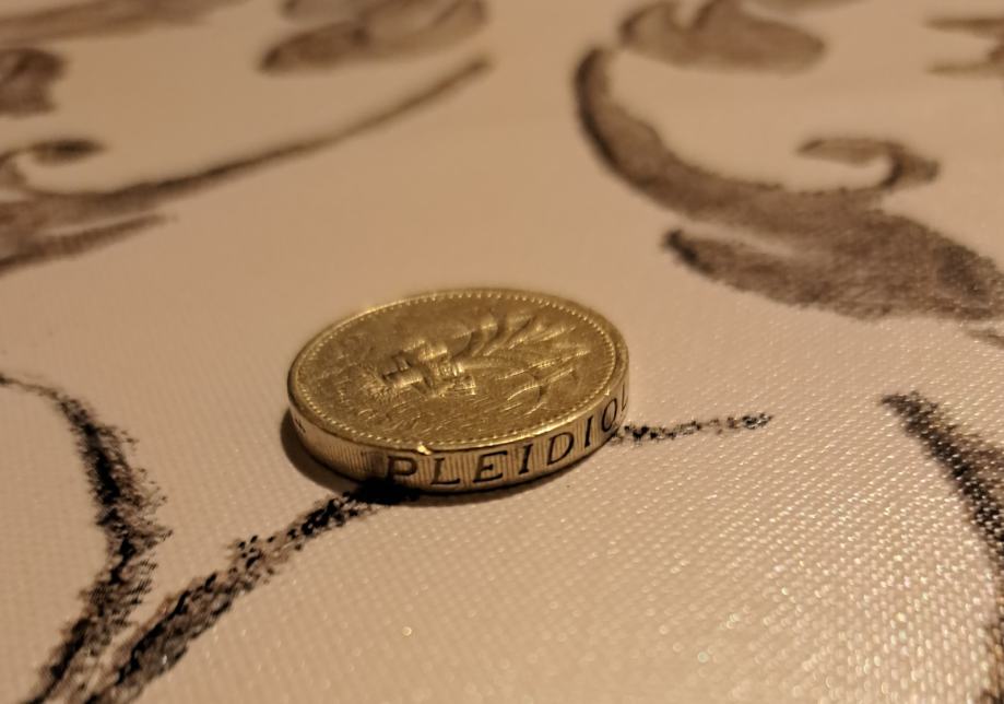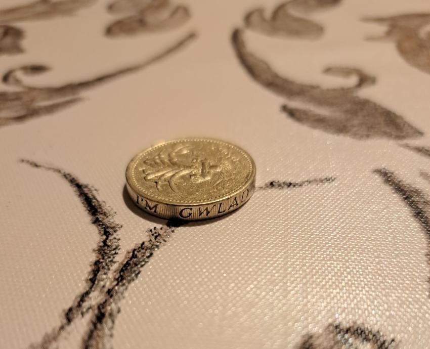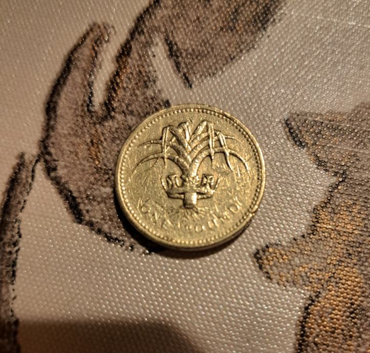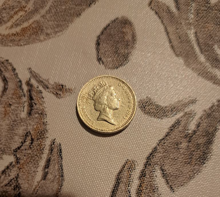 Rijedak novčić od jedne funte Elizabete II iz Ujedinjenog Kraljevstva iz 1985. godine. Ovaj kolekcionarski očuvani, poseban novčić zlatne boje prikazuje portret kraljice Elizabete II s jedne strane i očaravajući dizajn Kraljevskog znaka Walesa >poriluk< s druge strane koji je okružen kraljevskim dijademom, odražava umijeće izrade i kulturni značaj Britanske valute iz tog doba.