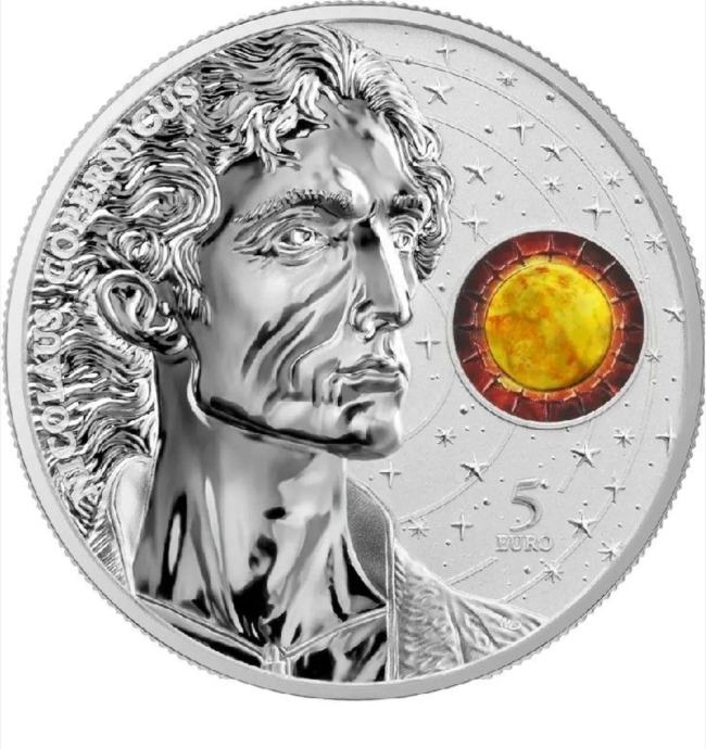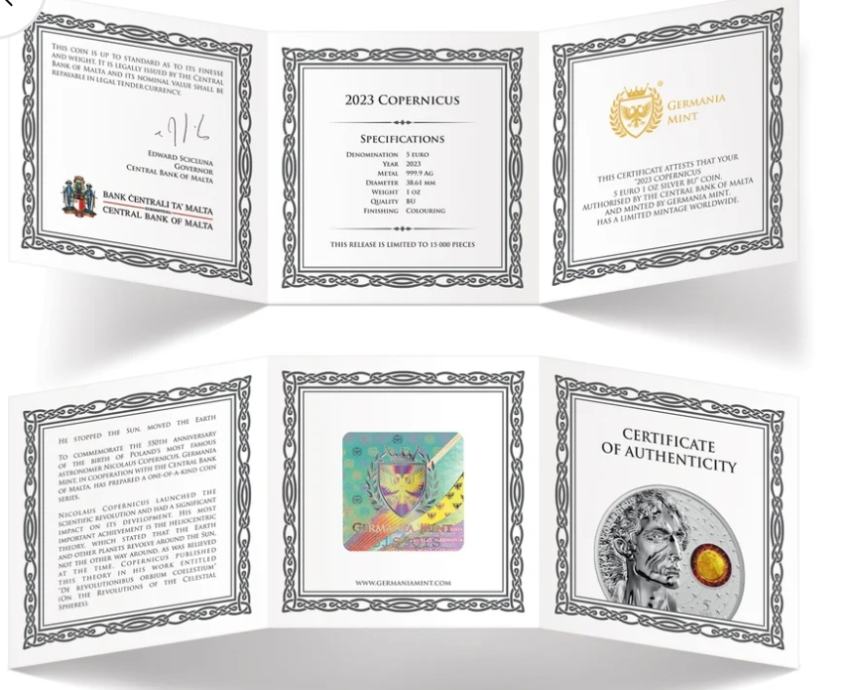 U čast 550. obljetnice rođenja najpoznatijeg poljskog astronoma, Germania Mint je stvorila jedinstveni novčić s nakladom od 15.000 komada: 2023 Malta Copernicus 5 Euro 1 oz Silver BU .