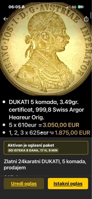 24 K Zlatni DUKATI, 1-5 KOMADA, 3.49g., Franz Joseph I, prodajem