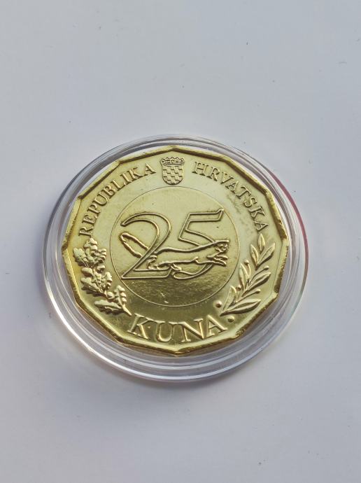 Jedna od rijeđih kovanica 25 kuna, kovana u samo 20 000 komada. 24 karatna pozlata. Prekrasan kolekcionarski primjerak.