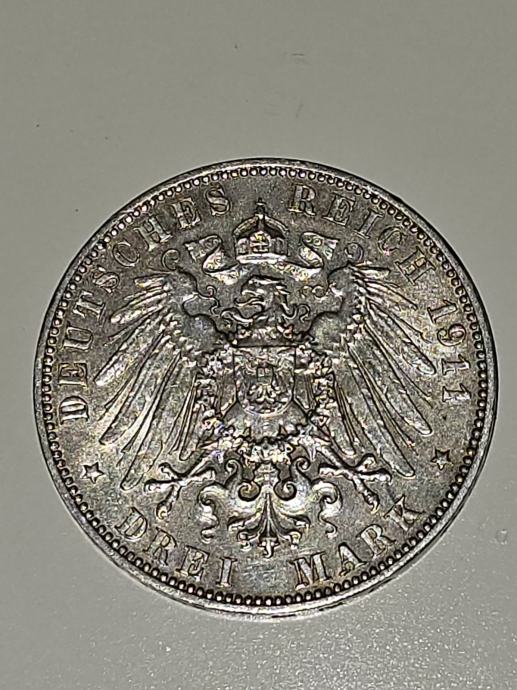Srebrni novčić od 3 marke iz Njemačkog Carstva iz 1911. godine u super stanju.