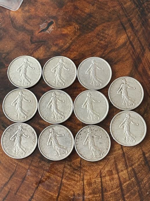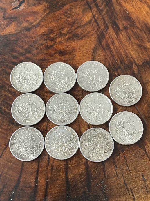 Prodajem 11 kovanica 5 franaka- Francuska 0.835 srebro