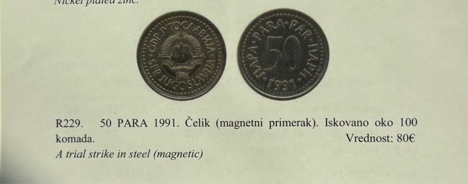 Na prodaju izuzetno rijedak probni (trial strike) primjerak kovanice 50 para 1991, izrađen u čeliku (magnetni), što nije standardni materijal za ovu emisiju.