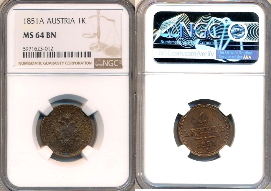 AUSTRIJA 1 Kreuzer 1851A NGC MS 64 BN