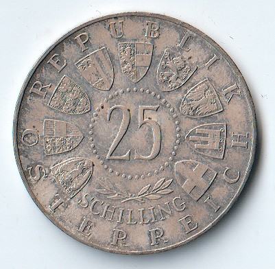 Revers nosi grbove austrijskih pokrajina i nominalu 25 SCHILLING.