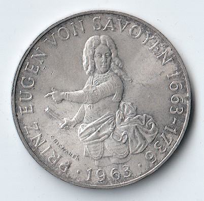 U ponudi austrijska srebrna kovanica od 25 šilinga iz 1963. godine, izdana povodom 300. obljetnice rođenja princa Eugena od Savoje (1663–1736).