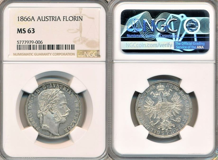 AUSTRIJA1 FLORIN 1866 A Franz Joseph I NGC MS 63