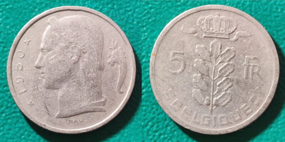 Belgium 5 francs, 1950 Legend in French - 'BELGIQUE' / 0,80 EURO !!!