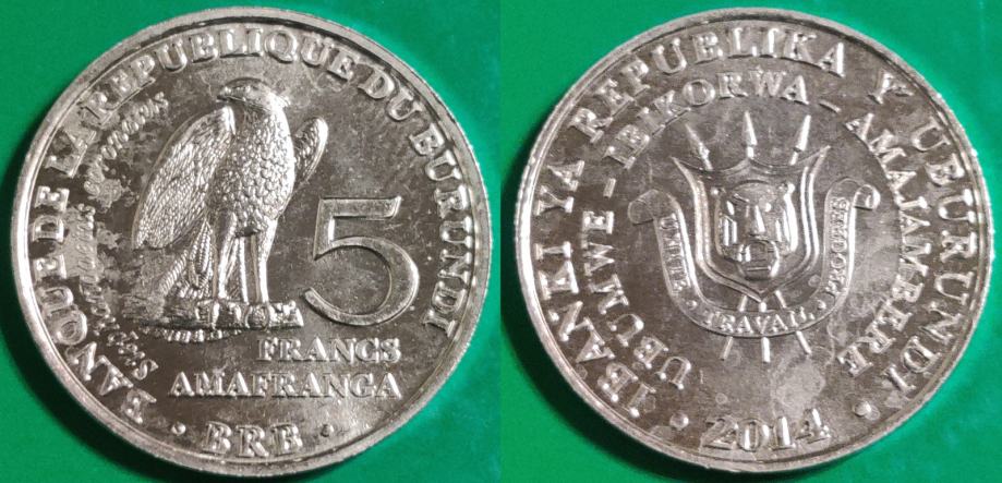 Burundi 5 francs, 2014 Birds - African Crowned Eagle (Stephanoaetus co