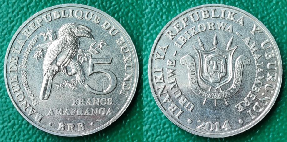 Burundi 5 francs, 2014 Birds - Trumpeter Hornbill (Bycanistes bucinato