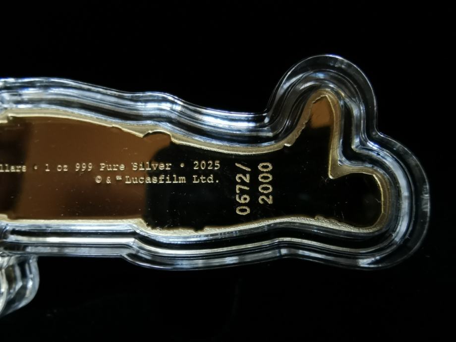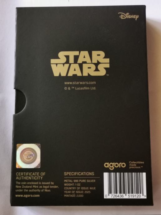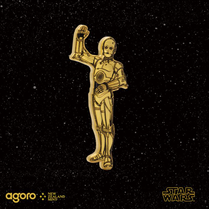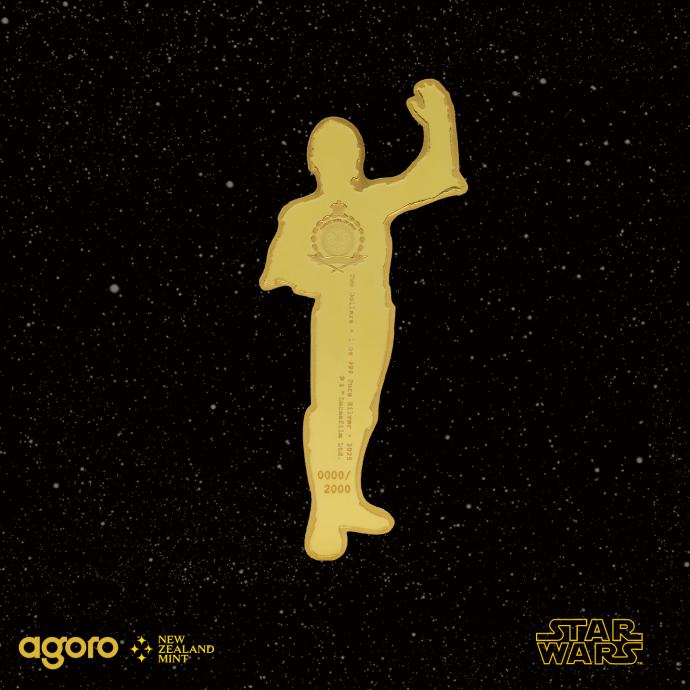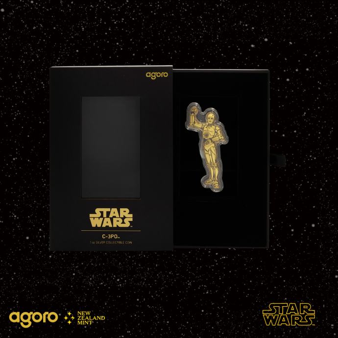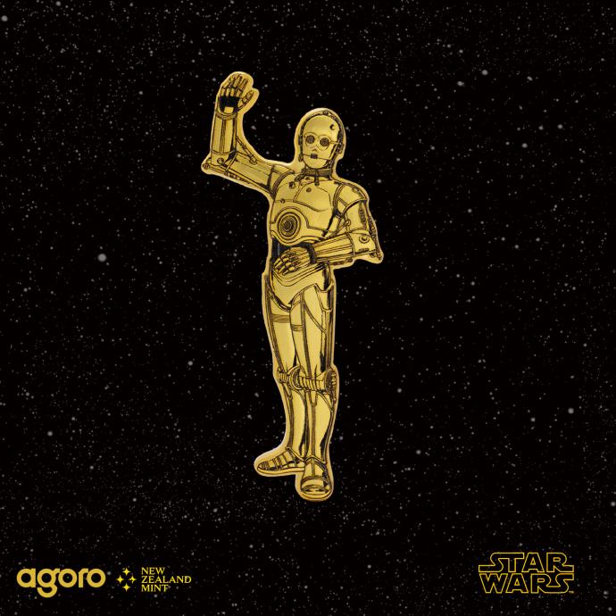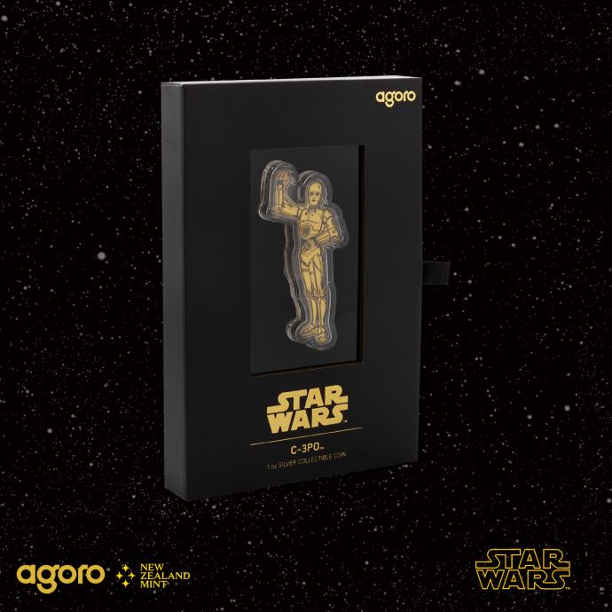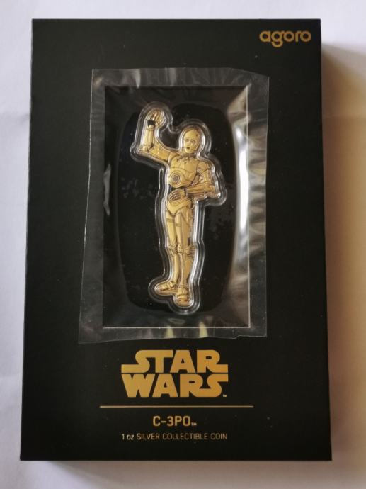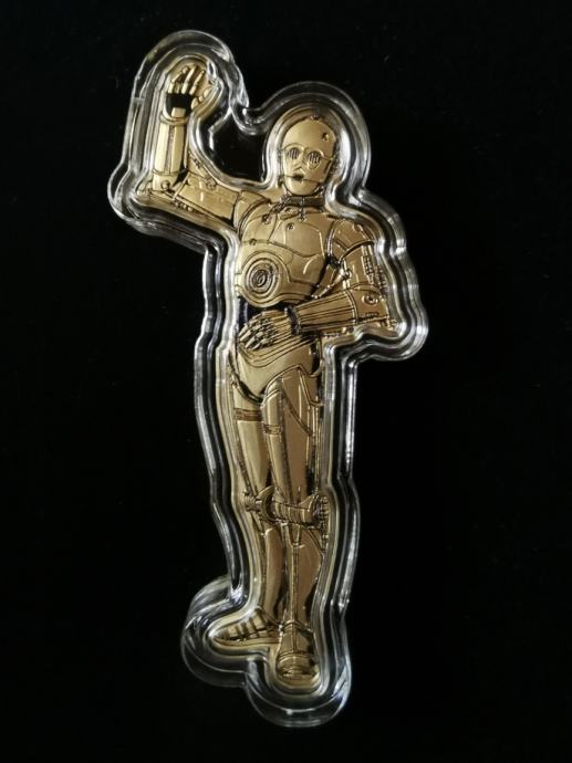 Prva kovanica u seriji Star Wars Droids posvećena je popularnom droidu C-3PO. Srebrnjak kovan od jedne unce 99,9% čistog srebra vjerno reproducira simpatičnog droida i izgleda posebno autentično zahvaljujući potpunom pozlaćivanju. Naličje prikazuje službeni grb Niuea, kao i apoen, težinu, finoću, godinu izdavanja, autorska prava i individualno numeriranje. C-3PO, često nazivan jednostavno 3PO, protokolarni je droid kojeg je konstruirao Anakin Skywalker na pustinjskom planetu Tatooine. Zajedno sa svojim partnerom R2-D2 bio je uključen u brojne značajne događaje u galaktičkoj povijesti od posljednjih dana Stare Republike do ere Prvog reda. Jedinstveno oblikovana i djelomično pozlaćena srebrna proof kovanica doalzi u posebno dizajniranoj kutiji s prozorčićem za prikaz i certifikatom. Limitiran na 2000 komada.