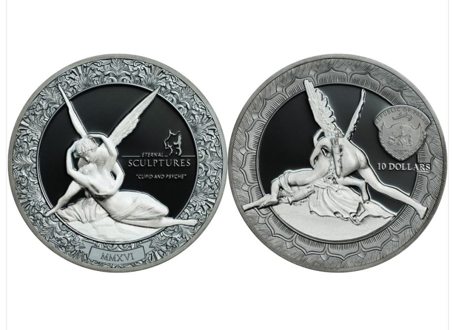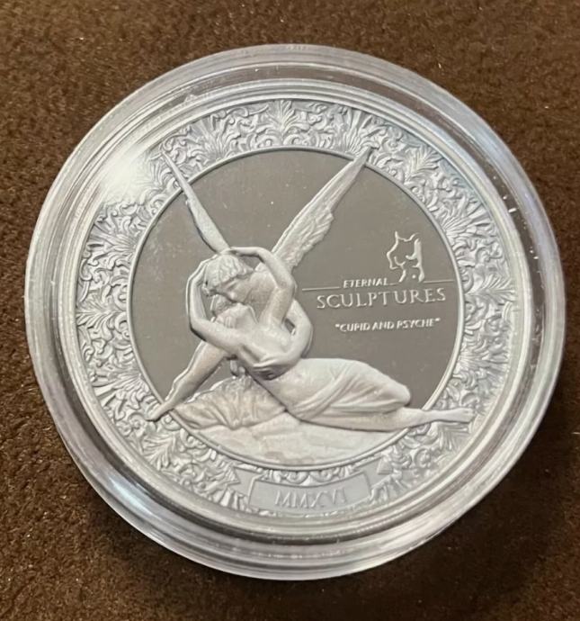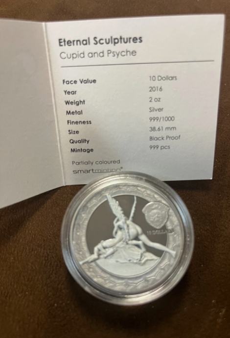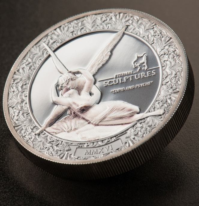 Ovaj srebrni novčić od 2 unce prvo je izdanje nove serije „Vječne skulpture“ i posvećen je ljubavnoj priči, izvorno iz Metamorfoza, i dobro poznatoj skulpturi - Kupidu i Psihi. Po prvi put, novčić ima dvije strane Smartminting! Ovaj novčić ima mramorni efekt, nevjerojatne detalje na visokoreljefnoj površini i kvalitetu Black Proof.