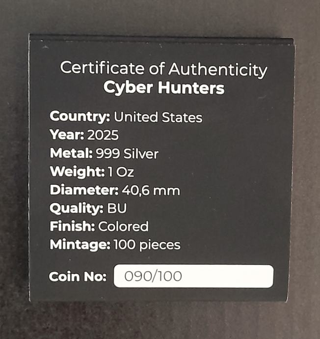 Ovaj izuzetni srebrnjak od 1 unce prvo je izdanje u seriji "Cyber Hunters" i predstavlja Cyber Eaglea, futurističku reinterpretaciju jednog od najstrašnijih prirodnih grabežljivaca. Odlikuje ga inovativni kibernetski dizajn, oživljen živim bojama i zamršenim detaljima. Dolazi u kapsuli, zajedno s certifikatom o autentičnosti.