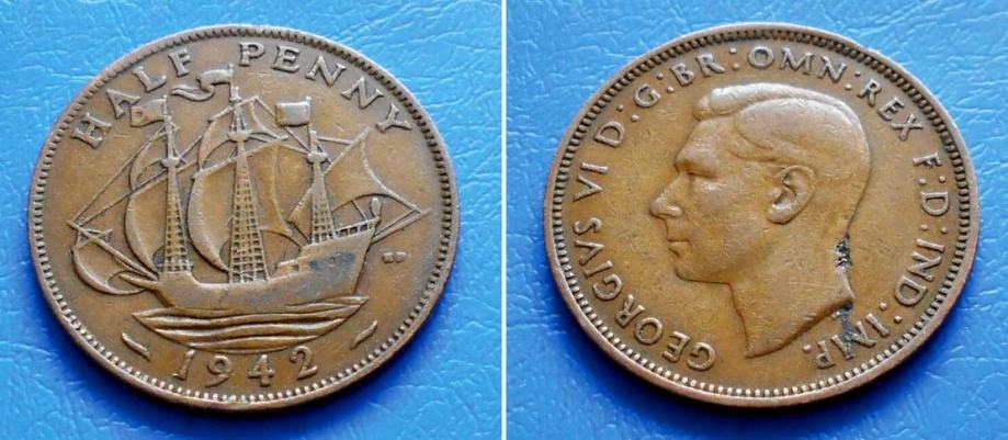 ENGLESKA GREAT BRITAIN 1/2 PENNY 1942 KM:844 GEORGE VI i JEDRENJAK **