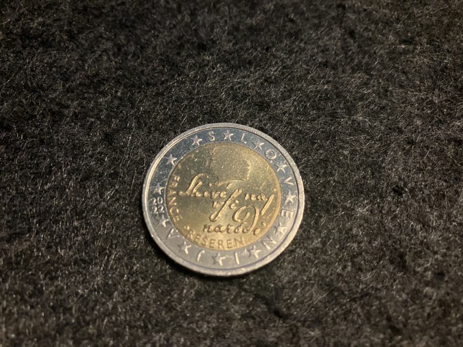 The profile board of the poet France Prešeren is accompanied with a legend indicating his name and the first line of the 7th stanza of Zdravljica (Slovenian national anthem) and is encircled by the twelve stars of Europe alternated with the letters of the word "SLOVENIJA" (Slovenia).