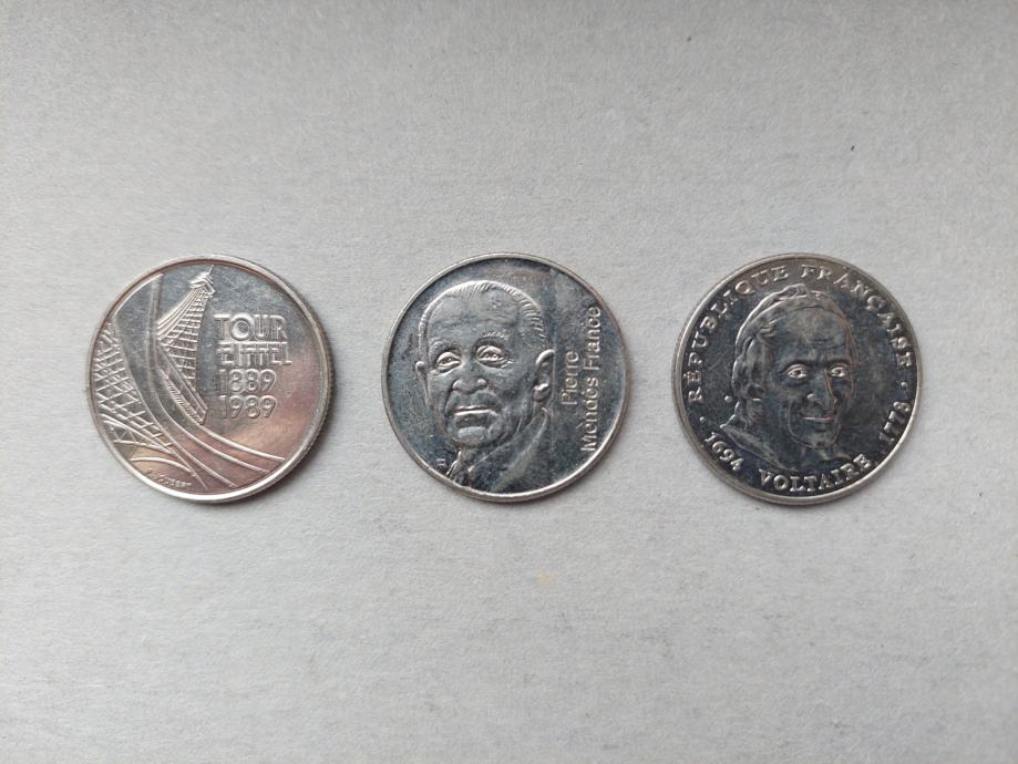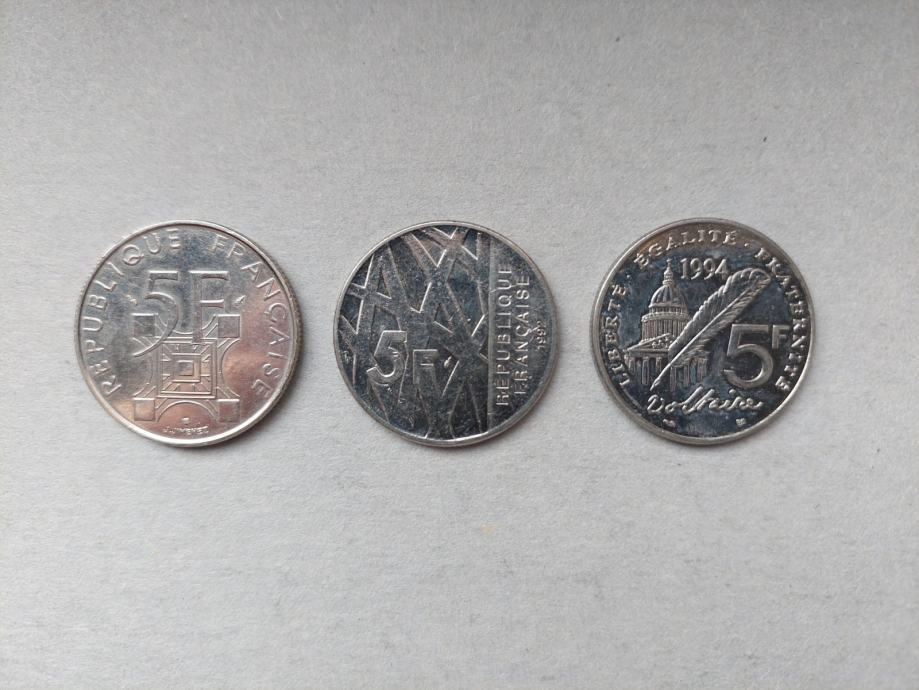 Lot sadrži tri prigodne kovanice od 5 francuskih franaka, i to: