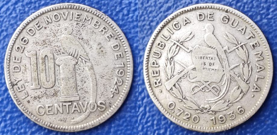 Guatemala, 10 centavos 1936 srebrnjak kovano samo 200.000 komada ***/#
