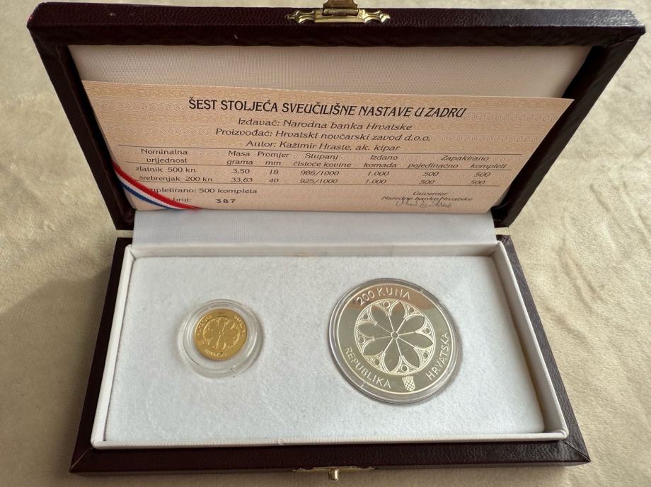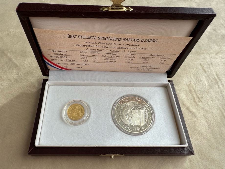 Komplet HNB-a šest stoljeća sveučilišne nastave u Zadru. Prigodni zlatni kovani novac od 500 kuna i prigodni srebreni kovani novac od 200 kuna.