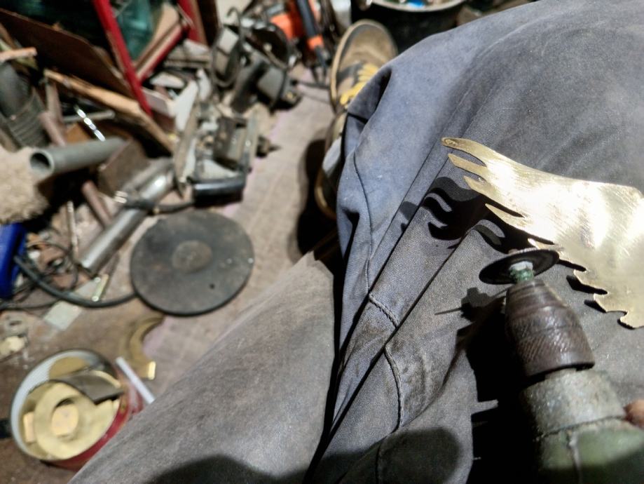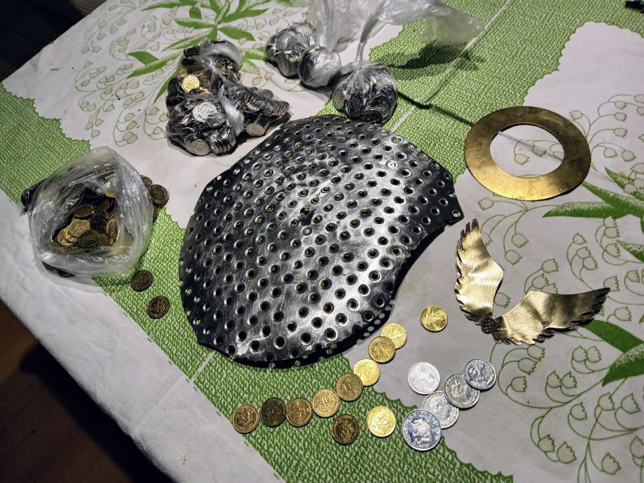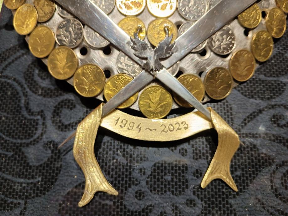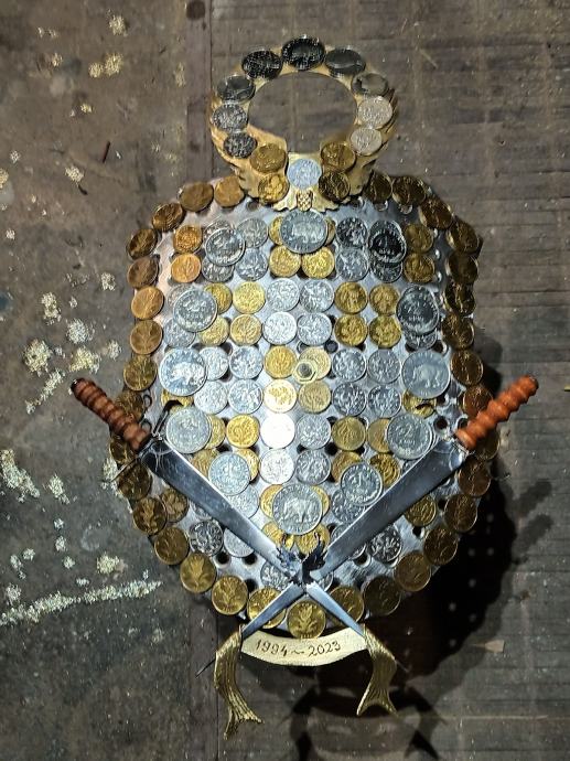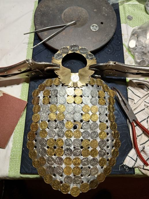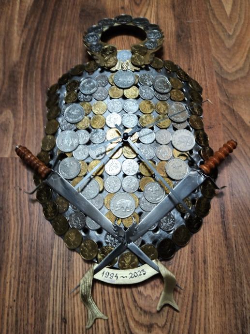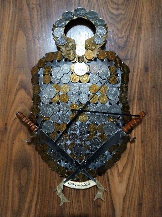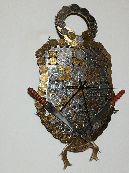 Prodajem veliki zidni sat,ručna izrada u obliku hrvatskog štita,napravljen od Rosfraja hladnim kovanjem u zaobljeni oblik štita. Dimenzije su 40x25cm. Na satu su svi detalji ručno napravljeni i ugrađene sve vrste kovanica Kuna i Lipa. Ne šaljem poštom, preuzimanje je osobno nakon pregleda.