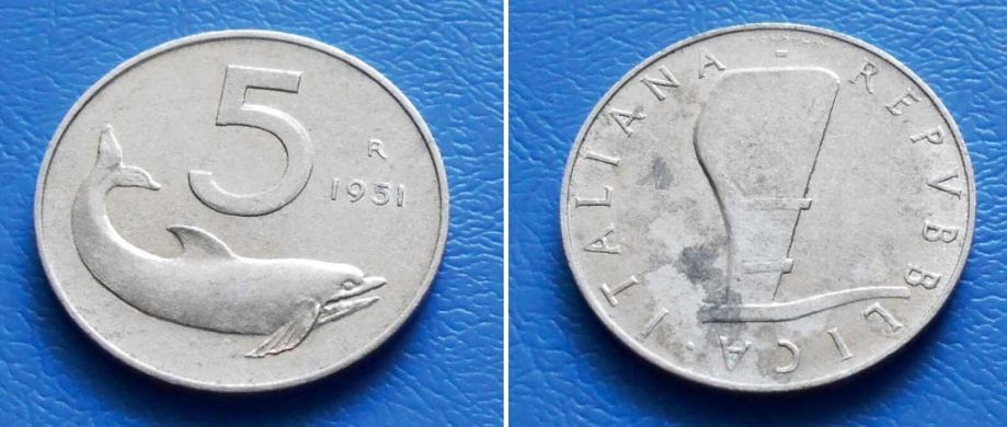 ITALIJA ITALY 5 LIRA 1951 R KM.92 - DUPIN i KORMILO