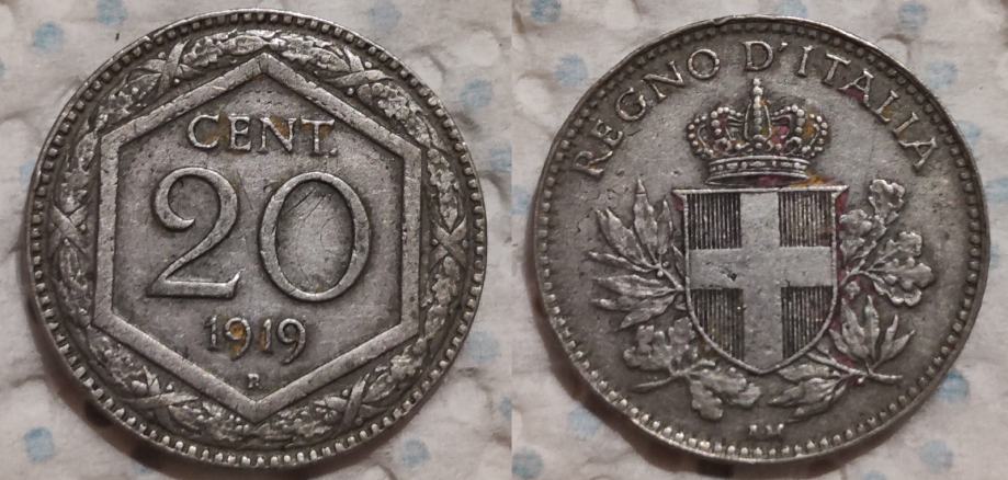 Italy 20 centesimi, 1919 New type: Coat of arms Smooth edge /