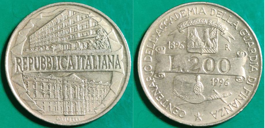 Italy 200 lire, 1996 100th Anniversary - Customs Service Academy ***/