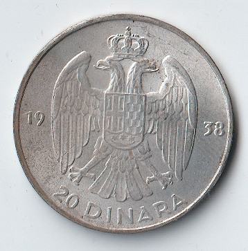 Revers: dvoglavi orao s krunom i oznakom 20 DINARA 1938.