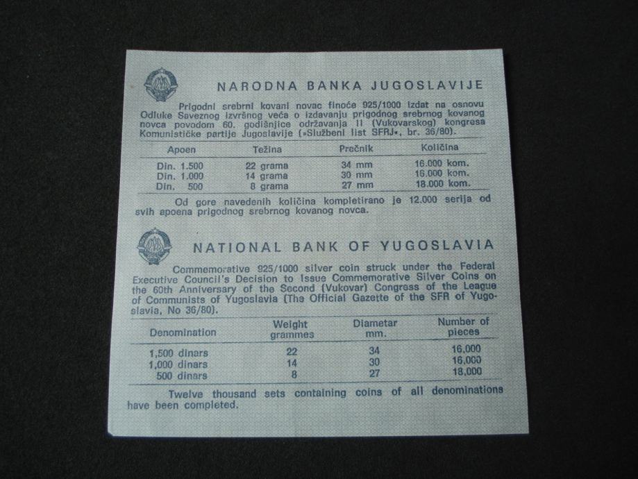 Jugoslavija, 500, 1000 i 1500 Dinara, 1980, srebro, Vukovarski kongres