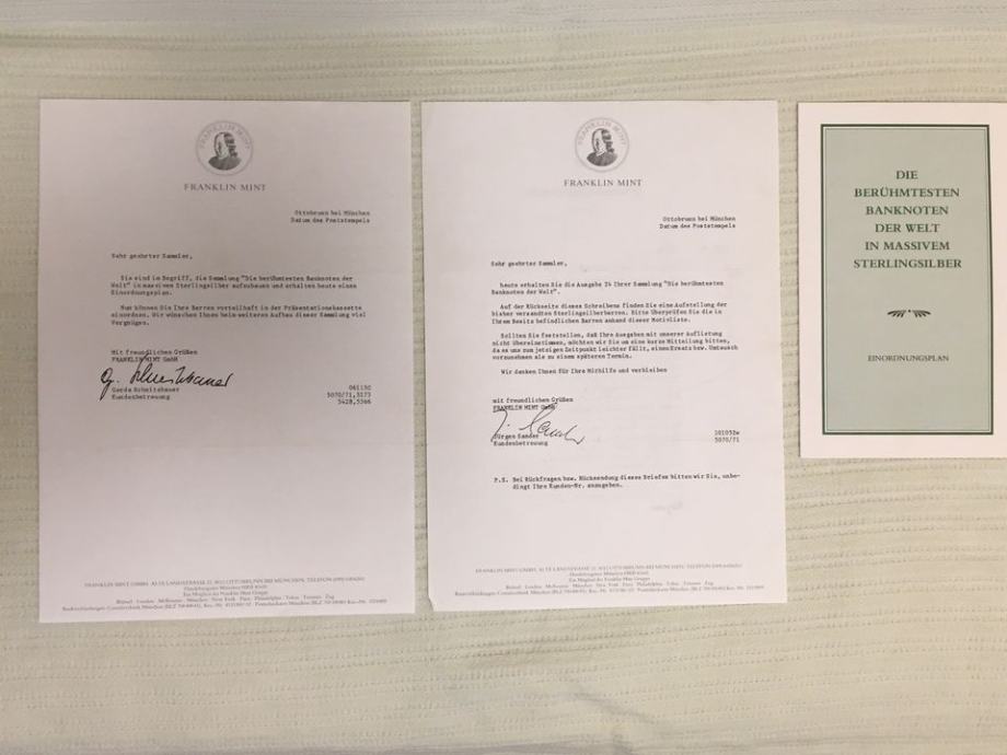 Prodajem kompletnu kolekciju najpoznatijih svjetskih novčanica u obliku srebrnih poluga 925/1000 iz kovnice Franklin Mint.