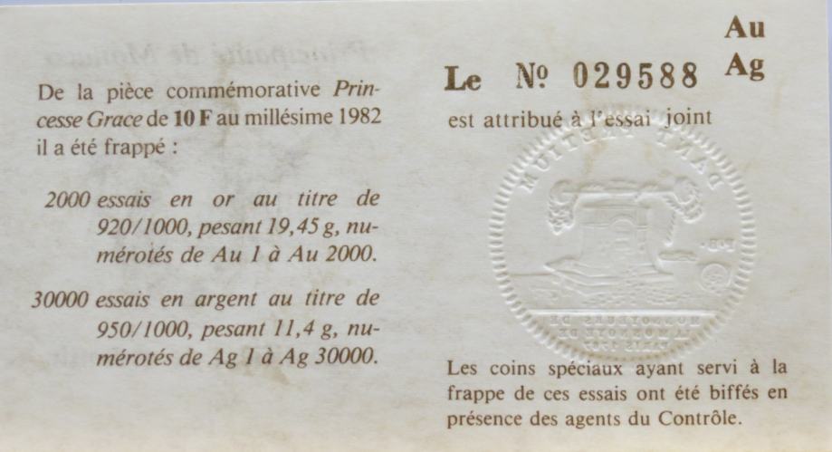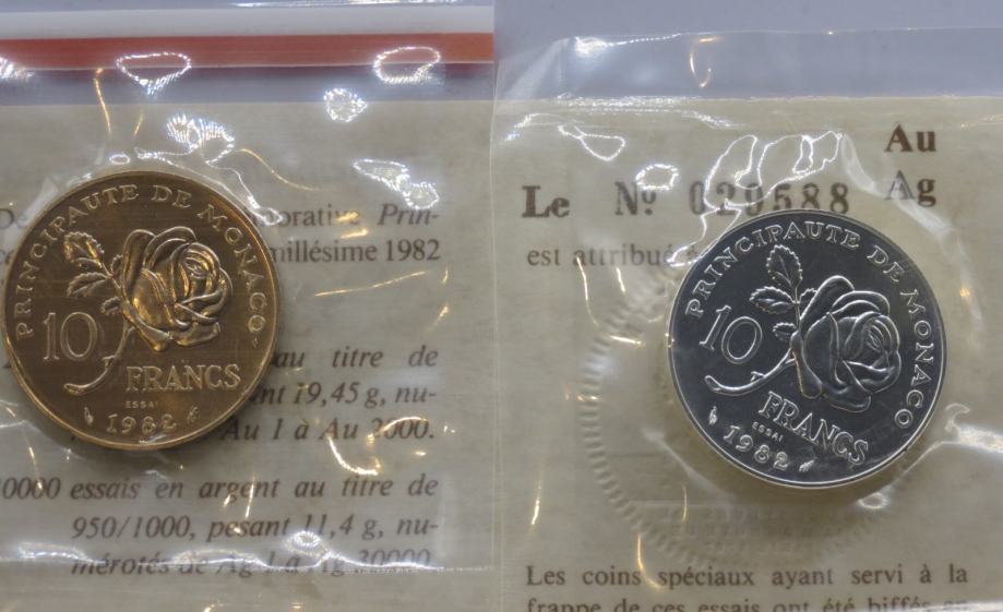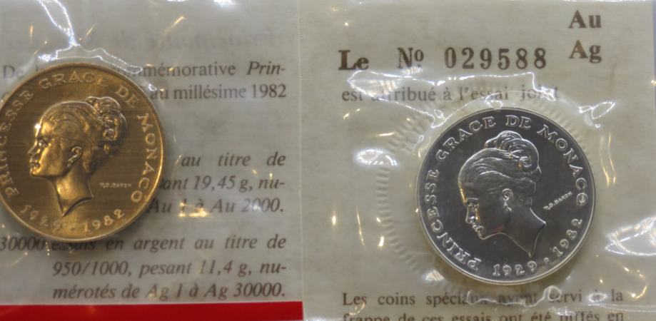 Dve komemorativne kovanice od 10 franaka kneževine Monako povodom pogibje princeze Grejs sa sertifikato.