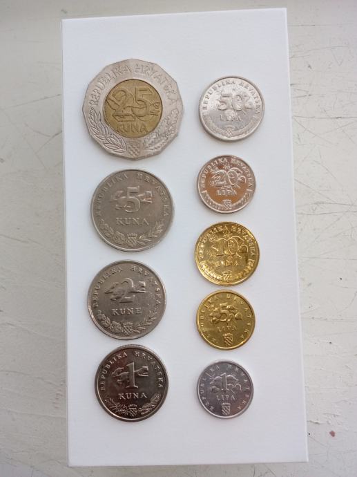 Komplet se sastoji od po jedne kovanice kuna /25 kn,5kn,2kn,1k / i od po jedne kovanice lipa/ 1lp,5lp,10lp,20lp,50lp/