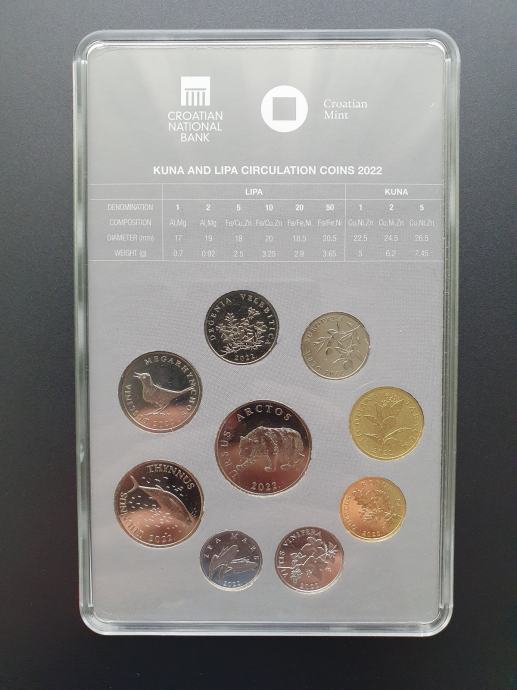 Koplet je izdala Hrvatska narodna banka, zadnji je komplet izdan prije uvođenja eura u Hrvatskoj. U ovaj komplet uloženi su apoeni optjecajnoga kovanog novca od 5, 2 i 1 kune te 50, 20, 10, 5, 2 i 1 lipe, koji su pušteni u optjecaj u 2022. godini. Moguć dogovor oko cijene. Idealan primjerak za sve sakupljače, ali i sve koji žele sačuvati dio Hrvatske povijesti. Odgovaram na poruke ako vas nešto zanima.