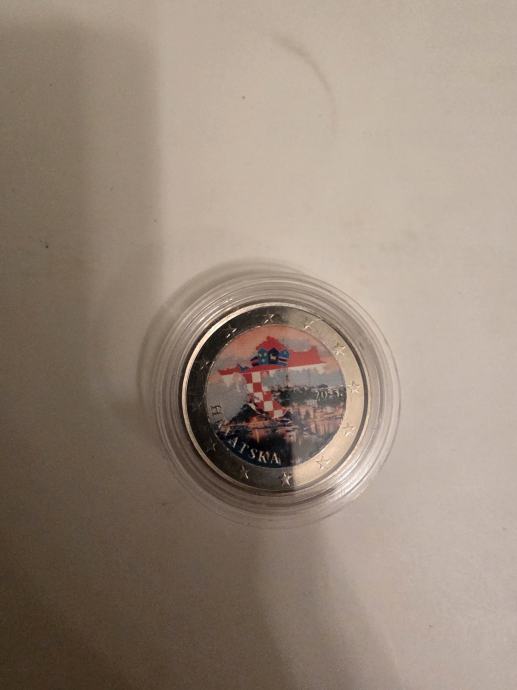 Pozlaćena 2 eura s motivom (hrvatska zastava-grb) u boji - unikatno s vrlo limitiranim tiražom.