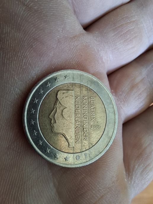 Očuvana kovanica od 2 eura iz 2001. godine, s likom Nizozemske kraljice Beatrix Koningin Der Nederlanden.