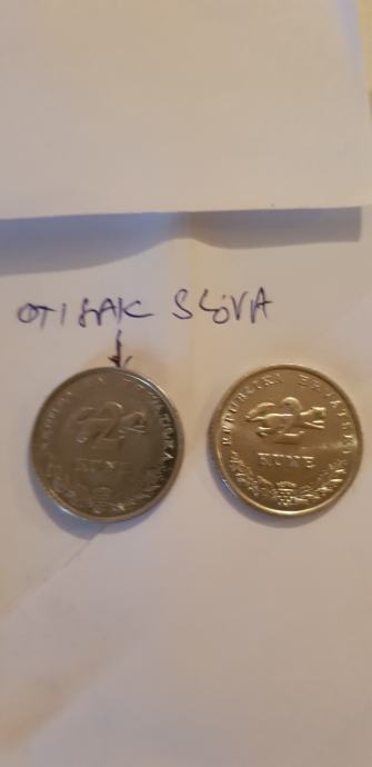 Kovanica 2 kune sa greskom , 2003. god. , tezina 6.06 grama , tezina orginalno ispravne je 6.20 grama , promjer je 24.4 mm , promjer standardne je 24.5 mmm , debljina kovanice je tanja , ostale tri razlike su ispisane na fotografijama , slova i brojke , ornamenti , obod i mat boja za razliku od standardne kovanice koja je sjajna , obod orginalno ispravne kovanice ima 94 ureza , kovanica sa greskom je bez ureza , glatka