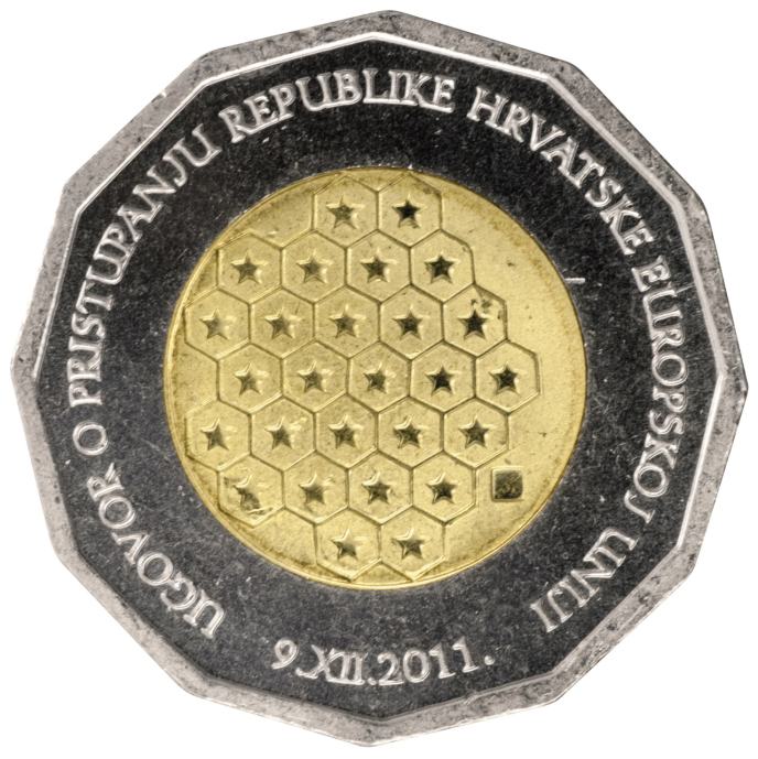 Motiv na licu: Unutar jezgre kovanog novca prikaz je pčelinjih saća koje simboliziraju Europsku uniju. Arhitekturu pčelinjih saća tvori dvadeset i sedam ćelija unutar kojih su zvjezdice, simboli zemalja članica Europske unije. U donjem polukrugu, uz konstrukciju pčelinjih saća, prikaz je kvadrata, simbola Republike Hrvatske, koji je na putu da postojeću konstrukciju pčelinjih saća dogradi dvadeset i osmom ćelijom, u koju će stupiti kao zvjezdica, nova punopravna članica Europske unije. Kružno, unutar prstena, ispisan je tekst »UGOVOR O PRISTUPANJU REPUBLIKE HRVATSKE EUROPSKOJ UNIJI«. U donjem središnjem dijelu prstena ispisan je datum »9. XII. 2011.«
