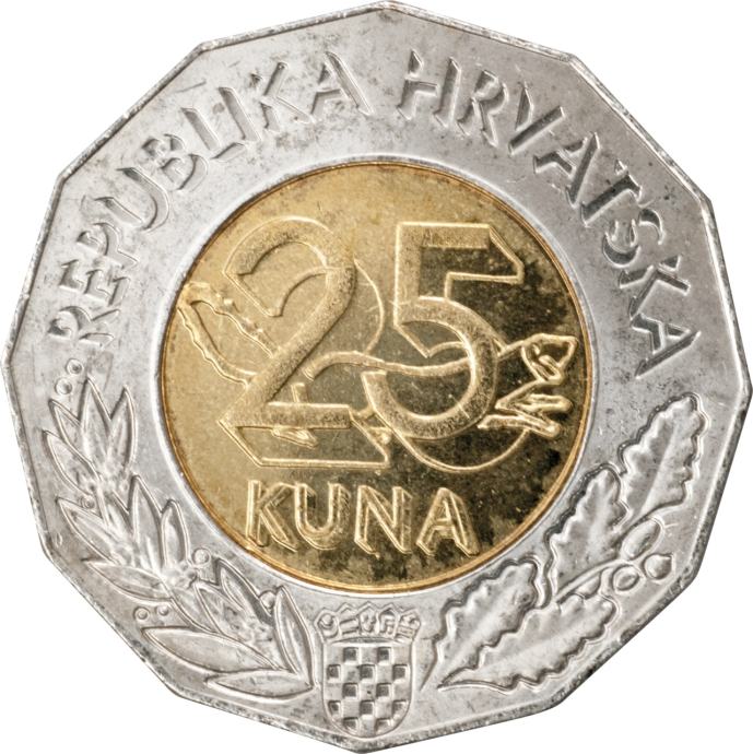 Motiv na naličju: U središnjem dijelu jezgre kovanog novca nalazi se brojčana oznaka nominalne vrijednosti »25«. Kroz konture brojaka vidi se kuna zlatica okrenuta nadesno, a njezino je tijelo ukomponirano u brojčanu oznaku nominalne vrijednosti. U donjem središnjem dijelu prstena kovanog novca smješten je grb Republike Hrvatske. Na kružnu površinu prstena, lijevo od grba, položena je grančica lovora u cvatu, a desno grančica hrasta lužnjaka s plodovima. U gornjoj kružnoj površini prstena istaknut je natpis »REPUBLIKA HRVATSKA«.