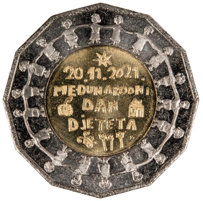 Motiv na licu: Unutar jezgre kovanog novca nalazi se prikaz kuće, jabuke, sunca, leptira i cvijeća, koji simbolički asociraju na neke od osnovnih dobrobiti i prava djece: siguran dom, hranu i slobodnu igru u prirodi. U jezgri kovanog novca nalazi se i prikaz datuma, prigodnog dana na koji se obilježava Međunarodni dan djeteta, "20. 11. 2021.", te je ispisan i tekst "MEĐUNARODNI DAN DJETETA". Kružno, unutar prstena kovanog novca, prikaz je djece koja su međusobno povezana u plesnom kolu koje simbolizira njihovu suradnju i zajedništvo te kreativnost i igru.