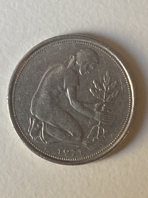 50 pfeninga, tip kleine J iz 1971, pola njemačke marke kovnica Hamburg, prepoznatljivo po slovu J s gornjom crtom, 40 €