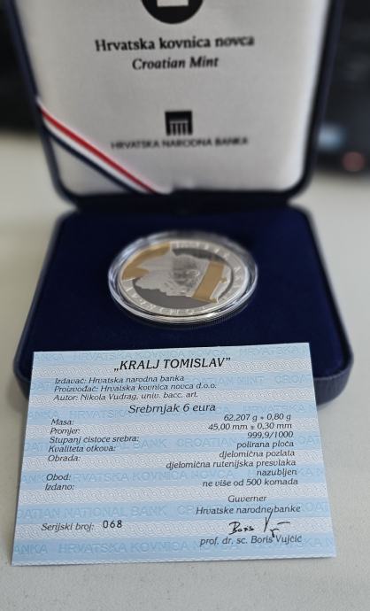 Hrvatska narodna banka u suradnji s Hrvatskom kovnicom novca izdala je srebrnjak „Kralj Tomislav“ mase dvije unce (62,207 grama). Srebrnjak nominalne vrijednosti 6 eura otkovan je u najvišoj kvaliteti otkova polirana ploča. Posebnosti ove kovanice doprinose obrade: djelomična pozlata i djelomična rutenijska presvlaka. Izrađen od srebra čistoće 999,9/1000 prigodan je dar za posebne prigode. Srebrnjak se izdaje u ograničenoj seriji od samo 500 primjeraka, a dolazi u kutiji s certifikatom koji potpisuje guverner Hrvatske narodne banke.