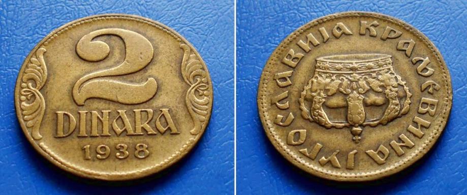KRALJEVINA JUGOSLAVIJA YUGOSLAVIA 2 DINARA (VELIKA KRUNA) 1938 KM.20