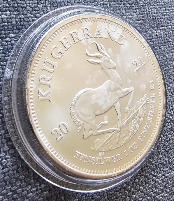 Naličje: Na naličju svih južnoafričkih srebrnih kovanica Krugerranda nalazi se slika antilope Springbok. Iznad Krugerranda nalazi se naziv kovanice "KRUGERRAND". Datum , "2021", podijeljen je sa svake strane antilope s dvije znamenke s lijeve i dvije s desne strane. Težina, sadržaj i denominacija ugravirani su ispod antilope s tekstom "FYNSILWER 1 OZ FINE SILVER R1".
