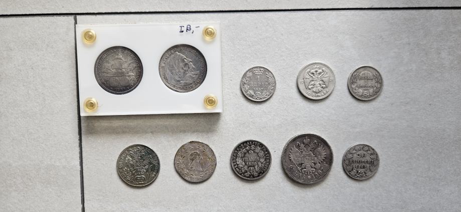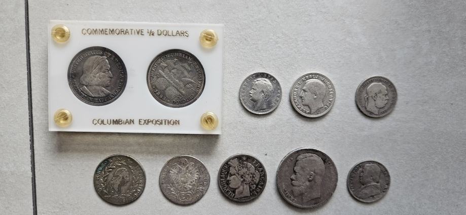 1/2 dollar 1492-1892, 1/2 dollar 1492-1893, 1 dinar 1897, 10 dinara 1931, 1 korona 1893, 20 kreuzers 1787, 20 kreuzers 1795, 2 franc 1870, 1 rouble 1897, 20 baiocchi 1865