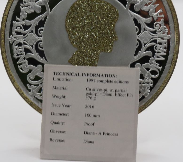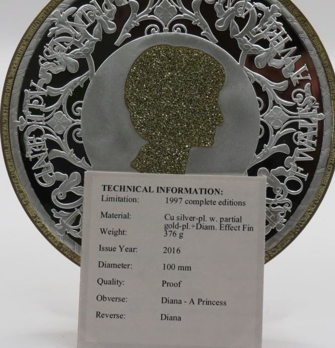 Prodajem ekskluzivni medaljon iz serije “ Diana – A Princess” , izrađen 2016. godine u limitiranom tiražu od 1997 primeraka, sa serijskim brojem C01838.