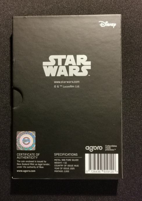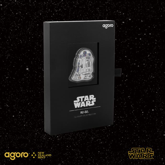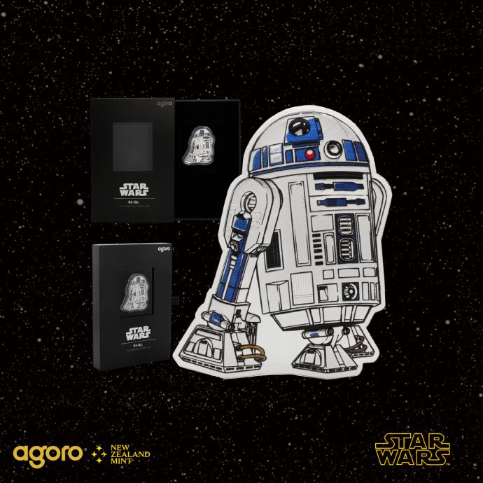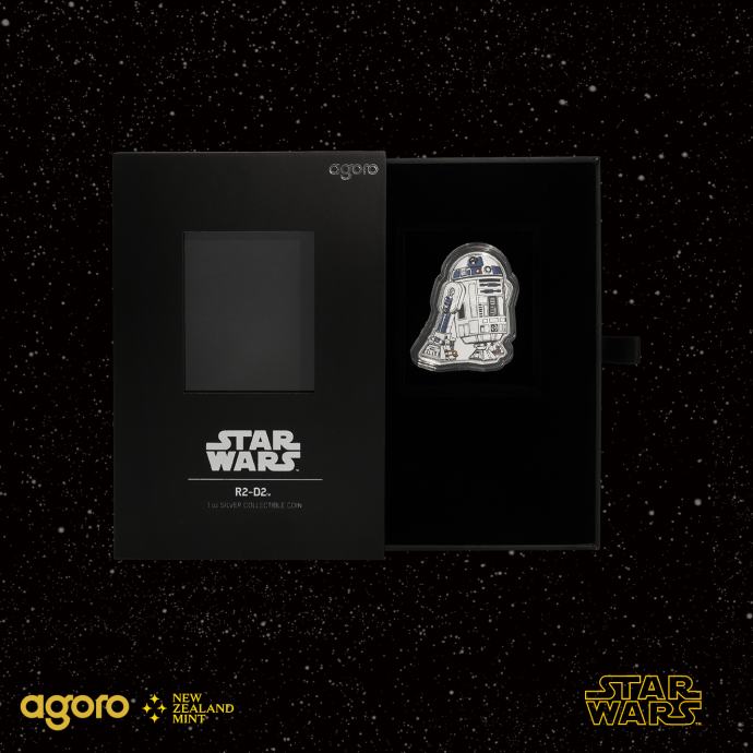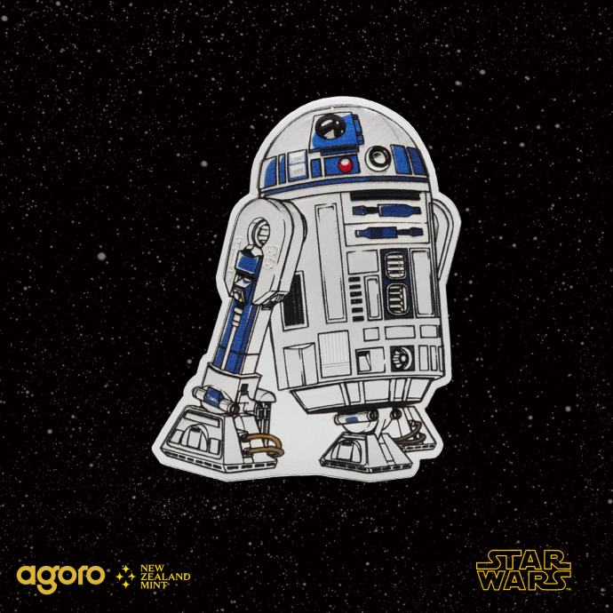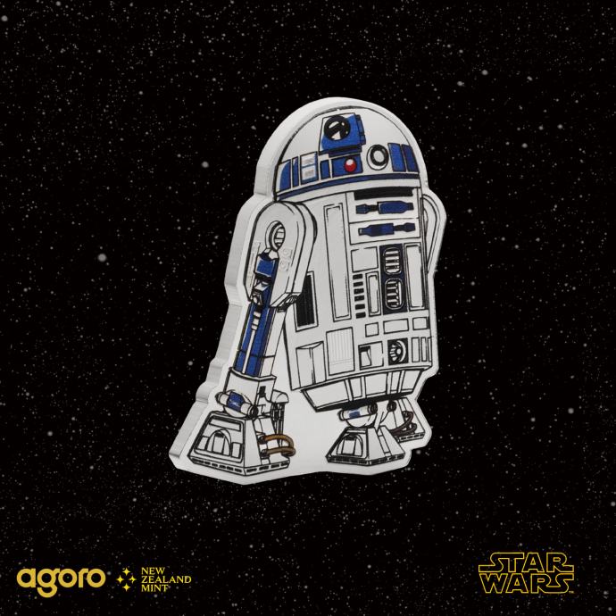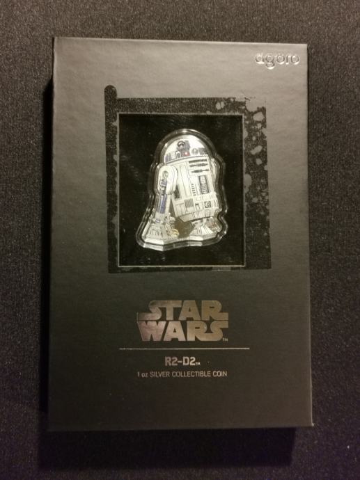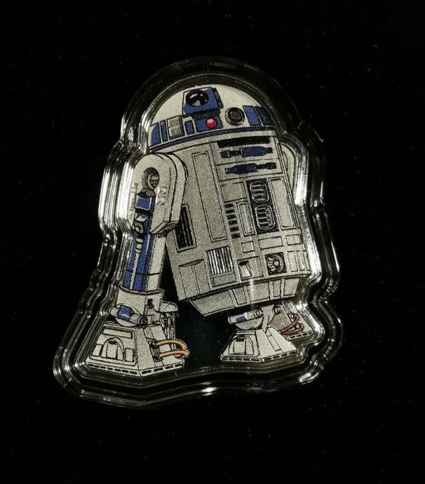 Druga kovanica u novoj seriji Star Wars Droids posvećena je popularnom astromehaničkom droidu R2-D2. Srebrnjak kovan od jedne unce 99,9% srebra vjerno reproducira simpatičnog droida. Naličje prikazuje službeni grb Niuea, apoen, težinu, finoću, godinu izdavanja, autorska prava i individualno numeriranje. R2-D2, često nazivan samo R2, bivši je droid senatorice Padmé Amidale. Zajedno sa svojim kasnijim partnerom C-3PO, bio je uključen u brojne značajne događaje u galaktičkoj povijesti od posljednjih dana Stare Republike do vremena Prvog reda i simbol je hrabrosti i odanosti. Jedinstveno oblikovana i obojena srebrna proof kovanica R2-D2 dolazi u originalnoj kutiji kovnice Novog Zelanda uključujući certifikat autentičnosti. Limitiran na 2000 komada