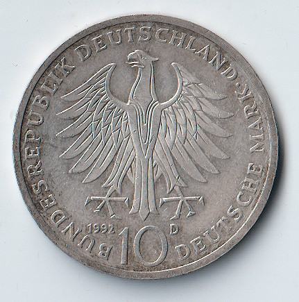 Revers nosi njemačkog saveznog orla i nominalu 10 DEUTSCHE MARK 1992.