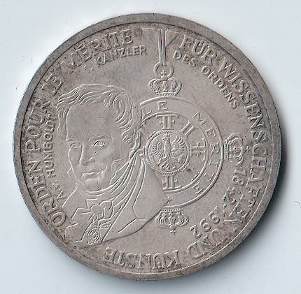 U ponudi srebrna njemačka prigodna kovanica od 10 Deutsche Mark iz 1992. godine, izdana u čast Alexandera von Humboldta, jednog od najvažnijih prirodoslovaca i istraživača 19. stoljeća.
