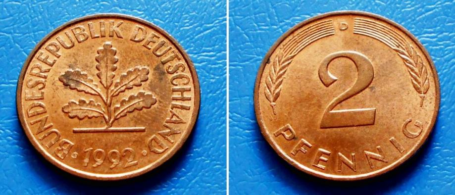 NJEMAČKA GBR GERMANY 2 PFENNIG 1992 D KM:106a - LISTOVI HRASTA