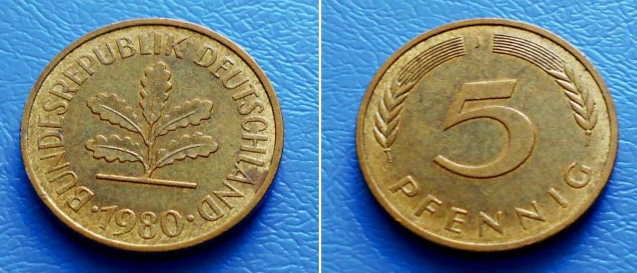 NJEMAČKA GBR GERMANY 5 PFENNIG 1980 J KM:107 - LISTOVI HRASTA