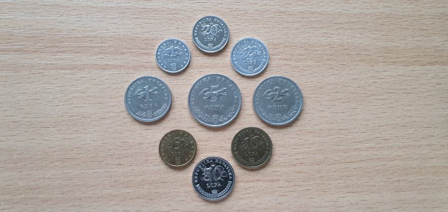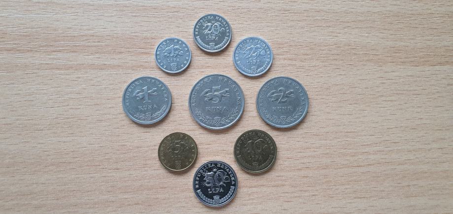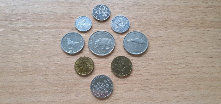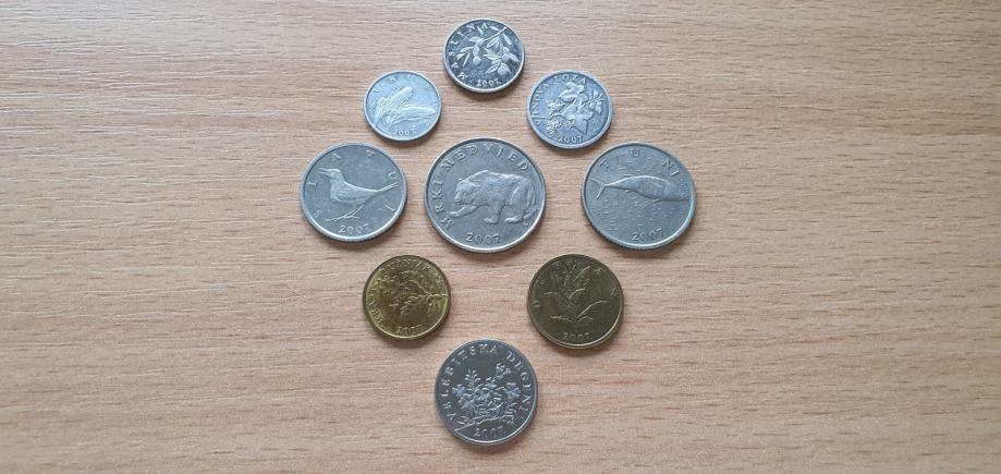 Komplet hrvatski kovanica iz 2007 godine, bez 1lipe i 2 lipe.